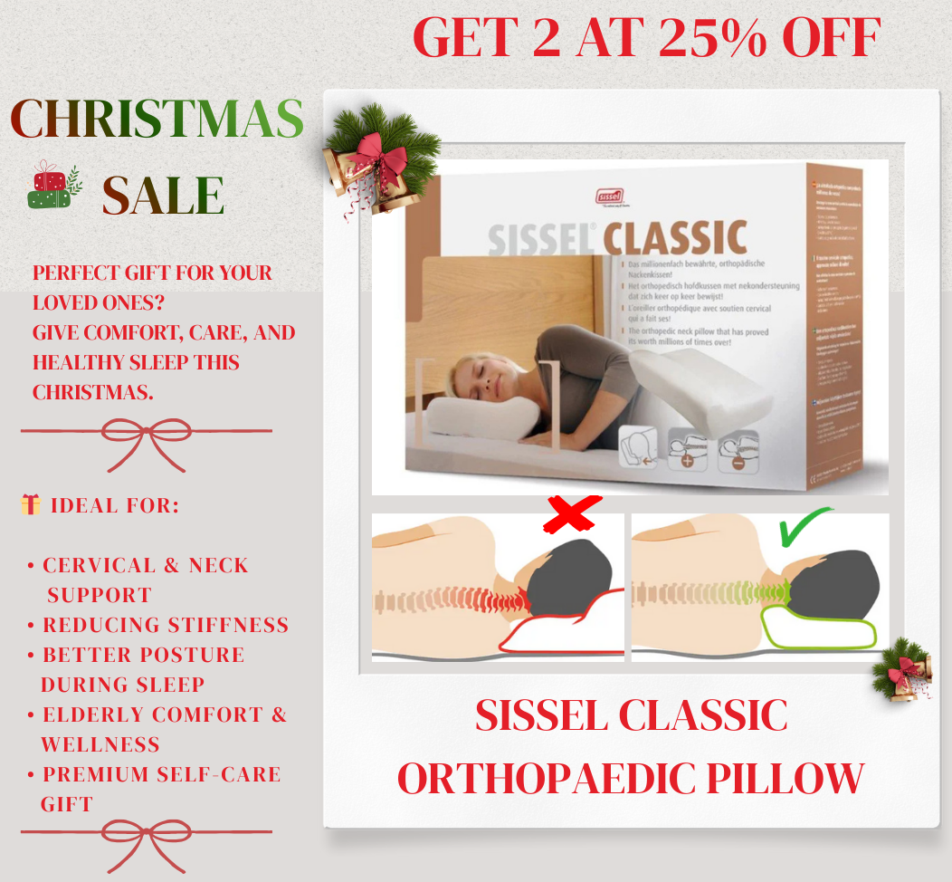 SISSEL® Orthopaedic Pillow The SISSEL® Orthopaedic Pillow gives substantial support to the lower cervical spinal column. As a result the entire shoulder and neck region are well supported. The pillow affords the user a good night sleep as well as waking up pain free. Due to its unique design the pillow fits in between the shoulder and cervical spinal column. The unique angle of the pillow supports the neck and gently leads the spinal column into an anatomically correct position. This change in position can require 2-14 nights to adjust and to achieve a healthy night’s sleep. Features Available in 2 sizes (widthxdepthxheight) Large: 47cm x 33cm x 14cm. Suitable for most adults. Medium: 47cm x 33cm x 11cm. Suitable for children/small adults. Supplied with velour pillow case Extra pillow cases can be ordered by clicking here Sleeping on your side Tip: Angle the pillow so that the front of the “ridge” is against the clavicle, this will enable the head and chin to be over the “ridge” resting on the flat side of the pillow. Sleeping on your back Pull the pillow so that the shoulders are under the front of the ridge to give a better sleeping position. Physio Needs is Ireland’s only distributor of SISSEL® Products. **Please note that pillows cannot be returned for hygiene reasons**